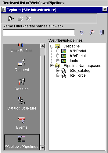 A Webflow namespace file is an XML file that configures the Webflow for a Web application, controlling the order in which your site's Web pages are displayed and initiating the execution of the business logic that is associated with them. You edit Webflow namespace files using the Webflow and Pipeline Editors, available in the BEA E-Business Control Center. These editors are graphical tools designed to help you visually create, modify, and validate Webflows for your Web applications.