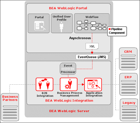 After the order is confirmed (step 4), a pipeline component named ConvertOrderRepPC will convert the persisted order to an XML representation, and places it on a Java Message Server (JMS) queue. The WebLogic Integration Business Process Management (BPM) event processor dequeues the order and processes it. For information about that process, see the section The Order Confirmation Portlet, Step4.jsp.