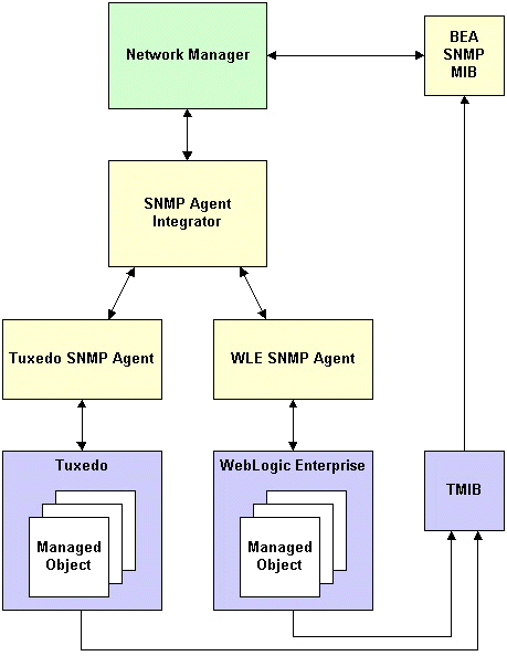 The BEA SNMP Agent for Tuxedo and WLE provides the following components to incorporate Tuxedo and WLE information within an SNMP management framework: