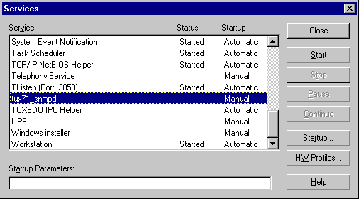 The installation program for Windows NT installs the SNMP agent as a single Windows NT service. If you want to run multiple instances of the agent to monitor multiple Tuxedo or WLE domains, you need to install additional Windows NT services for the additional agents.
