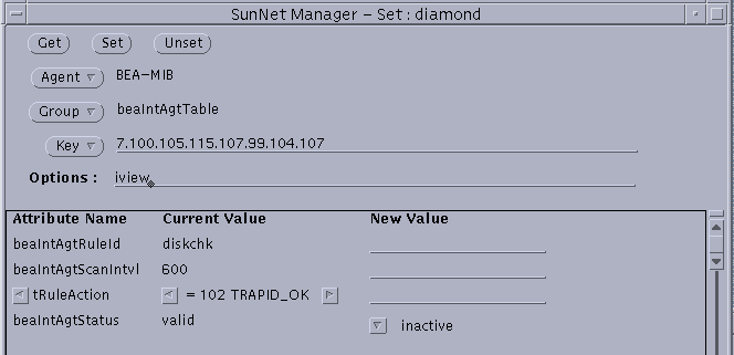 Polling for that rule can be de-activated from the management station (or by using the snmptest utility packaged with the BEA SNMP Agent Integrator) by setting the value of that object to inactive (an integer value of 3). Setting the value to 2 (invalid) causes the RULE_ACTION entry to be deleted from the configuration file Figure 6-1shows the rule diskchk, discussed earlier, being set to inactive. Note that the read/write community string (in this example, iview) is required for set permission.