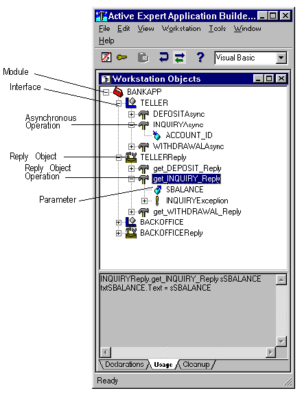 In the figure, the module BANKAPP is expanded to show the asynchronous operations contained in the TELLER interface. Note that the asynchronous operations are named in the form OperationName
