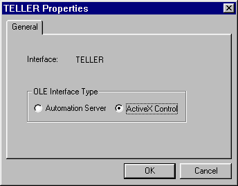 statement, or similar statements in other client tools. The ActiveX Control radio button indicates an ActiveX control, where an object is created by dragging the control onto the client form. Note that toggling the value of an OLE Interface Type radio button re-registers the selected interface object as an OLE interface of the new type. A confirmation window appears before the re-registration is done.