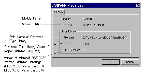 The properties window on a module indicates the module name and the full path name of the type library and type library source generated for a module.