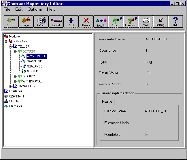 A parameter may be modified to enable or disable the return value, or change the passing mode by selecting IN, IN/OUT, OUT, or NO ACCESS. In addition, the BEA TUXEDO server information can be modified to reflect a display name change, a change in the exception mode return status, and enable or disable the mandatory status.
