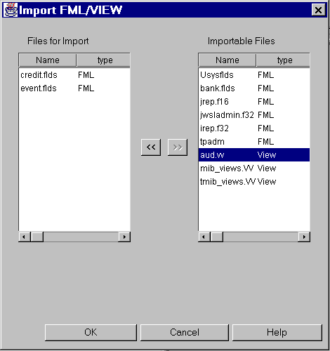 To import FML/VIEW files, use the Import FML/VIEW file window (shown in Figure 3-26.) The window has two display areas: Importable Files and Files for Import. The Importable Files display area contains existing FML and VIEW files that currently reside on your server.