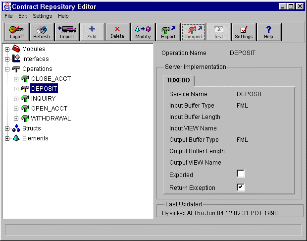 Once you have completed building an operation, you are ready to test it. Before you can test an operation, you must export it. "Export" serves as a flag that makes it available to client applications for use in run time.
