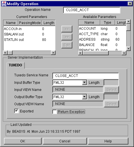 You get the Modify Operation window when you select the operation from the tree and choose Edit->Modify from the menu bar. To modify an operation, verify or change the operation name in the text field and move the parameters that you want to use into the Current Parameters display area. Type the TUXEDO service name, input/output buffer types, and select exported or return exceptions checkboxes, if applicable.