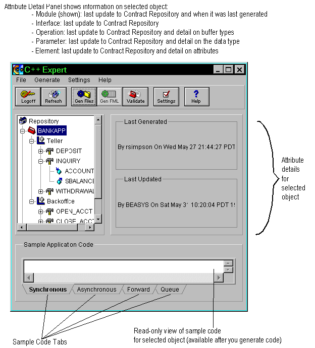 The Attribute Detail panel is located on the upper right panel of the Main Window and provides detailed information about the Contract Repository objects. The Sample Application Code panel displays sample code generated when an object is selected in the Contract Repository Tree View.