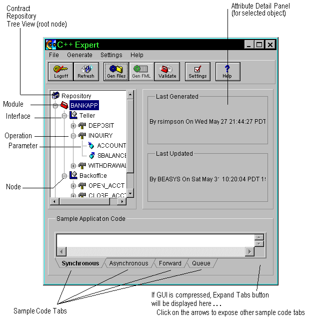 Figure 2-1 shows the C++ Expert Main Window including its view of the Contract Repository tree. Table 2-1 describes the tree objects at each node level.