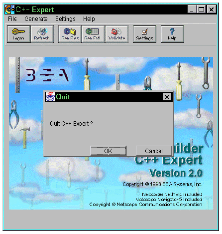 You can exit the C++ Expert by choosing File->Exit from the menu. A dialog box will ask you to confirm your action. If you exit without first disconnecting from the Contract Repository, the C++ Expert automatically disconnect from the Repository.
