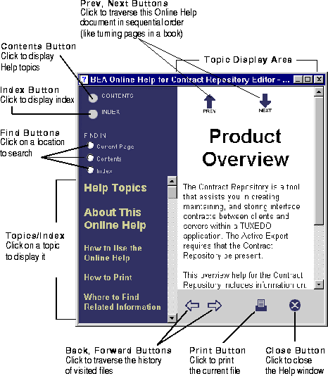 Figure 1 shows the online help with the clickable table of contents/index window.