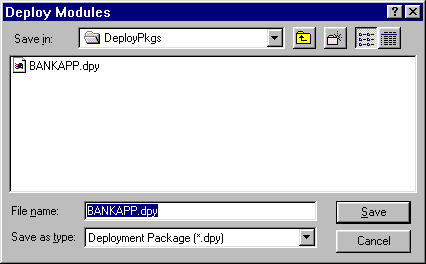 This brings up the Deploy Modules file window (a file browser) in which you can verify the file name and location where you want the deployment package saved. (The default location shown on the file browser is determined by how the Deployment options are set.)