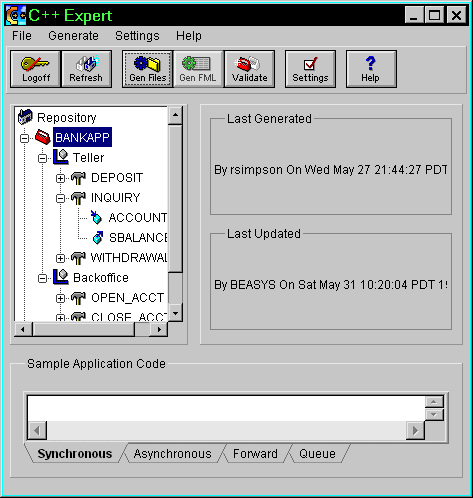 When the C++ Expert is connected to the repository the Main Window displays the root node of the Repository. You can use the C++ Expert to browse though the Repository objects with read-only access. The attributes of each selected object will be displayed in the panel on the right side of the Main Window.