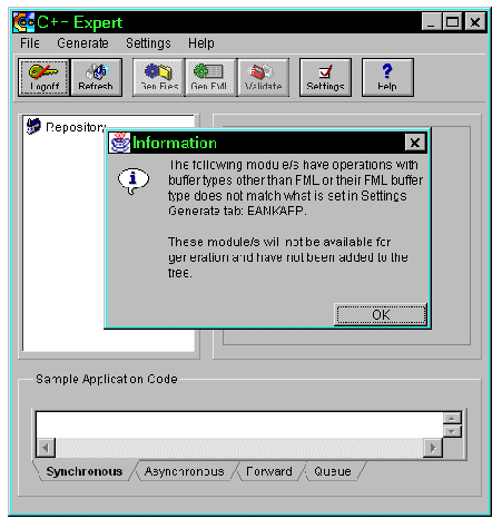 The Generate for FML Buffer Type field can be used to ensure that all the FML buffers used in all the services of a module match the selected buffer type. A dialog box will be displayed when a module fails this check (as shown in Figure 3-6) and those modules will not be shown in the Contract Repository tree view. When you change this field, the C++ Expert will remind you to refresh the current content of the C++ Expert repository tree view from the Contract Repository.