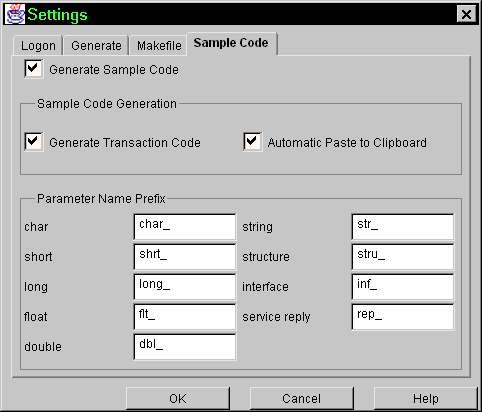 When the Generate Sample Code checkbox is enabled, the C++ Expert will generate sample application code and display it in the Sample Application Code window of the Main Window. (If the Automatic Paste to Clipboard checkbox is enabled, it is also copied to the system clipboard, allowing you to paste the sample code directly into your development environment.) If the checkbox is disabled, you cannot change the settings of any of the other fields on this window, the Sample Application Code window is not displayed on the Main Window and nothing is copied to the system clipboard.