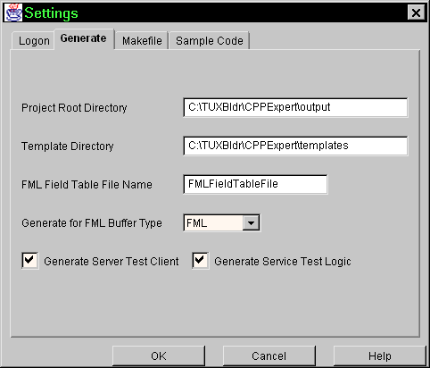 The FML Table File Name field is used by the C++ Expert when you generate an FML field table file, described in the Generating FML Field Tables section. When this file is generated, it is placed in the directory specified by the Project Root Directory field and given the name specified in this field with .fml appended. For example, if the Project Root Directory is set to: C:\TUXBldr\CPPExpert\output and the FML Field Table File Name is set to FMLFieldTableFile, the C++ Expert will put the generated FML field table in a file called: