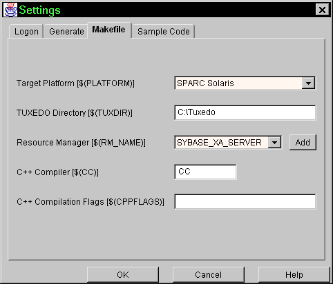 The contents of the TUXEDO Directory field is assigned to the The contents of the Resource Manager field is assigned to the For more information about fields on this window, refer to the Makefile Settings window description.