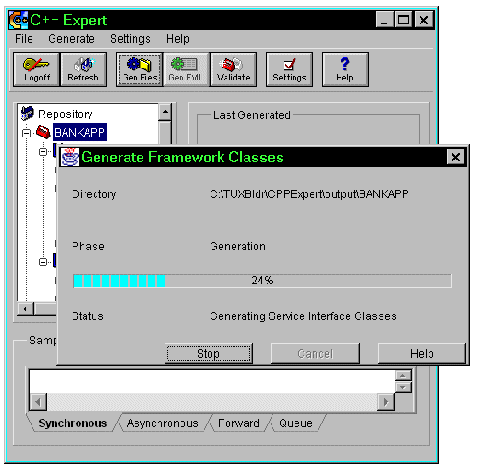 While the C++ Expert is generating these files, it will display the directory where the files are put, the phase of the process it is currently performing, and any status information. You can click on Stop to halt the process at any time.