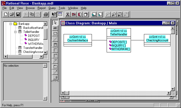 Now we can convert the use case diagram into an ideal object model using UML stereotypes. To do this, we examine our use case to discover the classes it suggests. Based on this, we create a class diagram to represent the classes and the stereotypes of the classes. (Rational Rose lets you create and assign a class diagram for a use case. We are still working mainly in the Use Case view in this phase.)