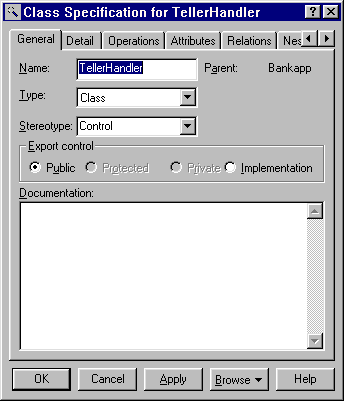 Figure 2-7 Class Specification for TellerHandler, General tab