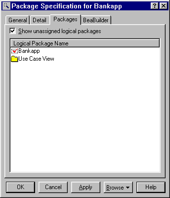 Figure 2-13 shows the Bankapp logical package listed in the Bankapp component package. Note that the checkmark indicates we have assigned the Bankapp logical package to the Bankapp component package.