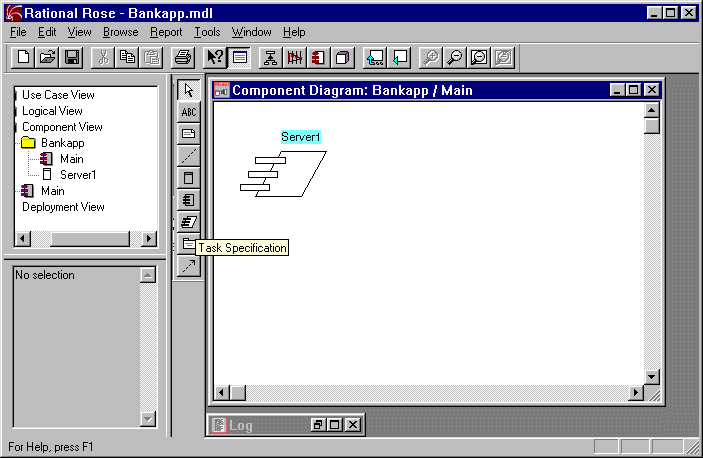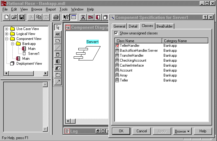 To access the component specification for a task module, double click on the new icon in your diagram. Figure 2-16 shows the Classes tab on the component specification for our Server1 task module along with Server1 task module displayed in the component diagram for Bankapp. Note that we have assigned the logical "TellerHandler" class to Server1. (Right mouse click and choose "Assign" from the popup menu to assign a logical class to a component module.)