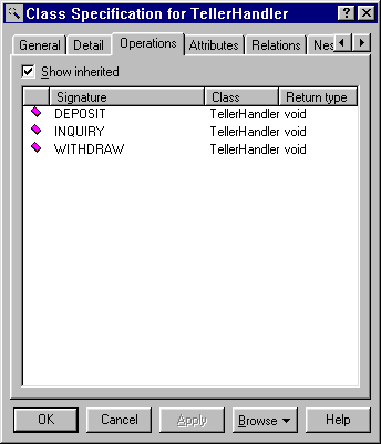 Once we add the operations to a class, the operations show up on the Operations tab of the Class Specification dialog for that class. Figure 2-8 shows the operations for our TellerHandler Class.