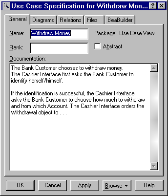 We document each use case with the use case specification tool. Figure 2-3 shows the specification documentation for the Bankapp use case.