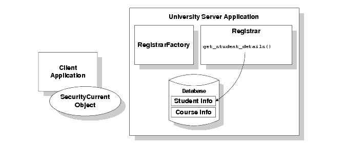 operation accesses the student information portion of the database to obtain student information needed by the client logon operation. The following figure shows the primary objects involved in the Security sample application: