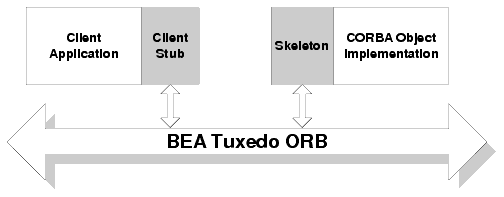 When a client application sends a request, the request is implemented as an operation on the client stub. When the client stub receives the request, the client stub sends the request to the Object Request Broker (ORB), which then sends the request through the Oracle Tuxedo system to the skeleton. The ORB interoperates with the TP Framework and the Portable Object Adapter (POA) to locate the correct skeleton and object implementation.