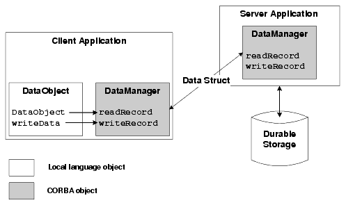 . The server application implements a CORBA process object that interacts with entities in persistent storage. This CORBA object is referred to in this chapter as the DataManager