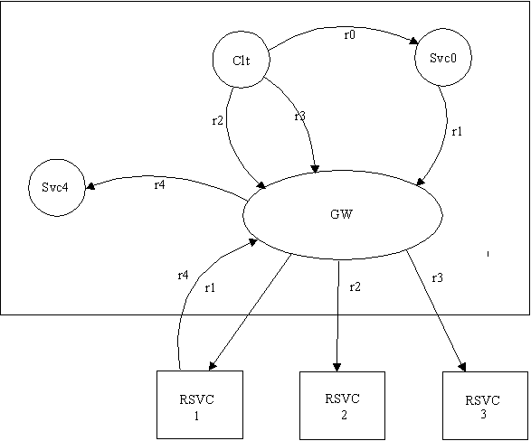Figure 5 shows the service request graph for a client that generates three service requests, one local (r0) and two remote (r2 and r3). Request r0 goes to a local service (Svc0), which generates another remote service request (r1). Request r1 goes to remote service Rsvc1, which issues a loop-back service request r4 to local service Svc4. Svc0 and Svc4 execute in different groups (G0 and G4). The /Domain gateway executes within another group (GW), and the remote services Rscv1, Rsvc2, and Rsvc3 execute in another domain (domain B).