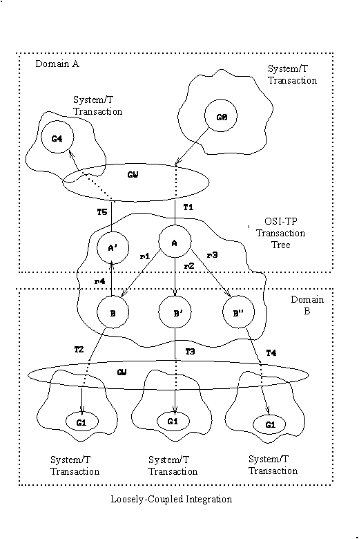 This property, however, only applies to outgoing service requests (that is, from the root domain to subordinate domains). It cannot be applied to incoming service requests. The OSI-TP instantiation consequently implements a loosely-coupled relationship; each incoming service request is mapped to a new System/T global transaction.