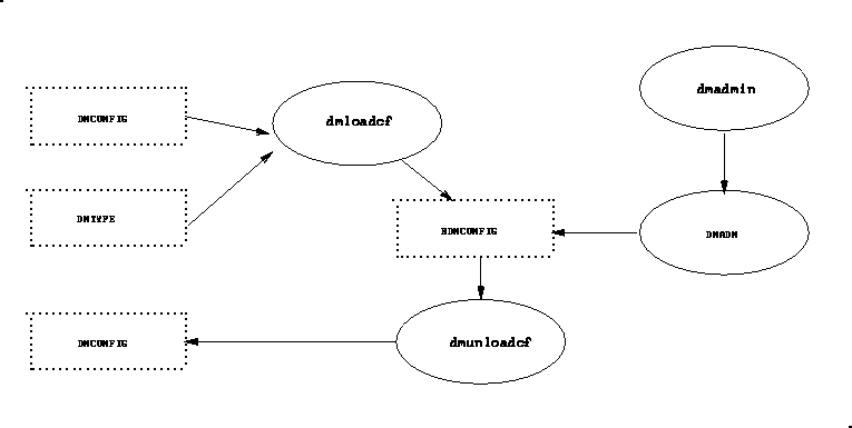 Therefore, in addition to tmadmin, a new administrative command, dmadmin(1) is provided. This command provides administrators with the run-time administration capabilities to maintain the /Domain configuration and active gateway groups. Figure 1 shows the relationship between administrative commands and servers.