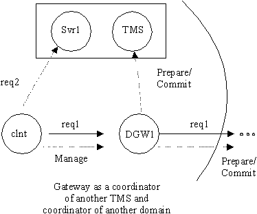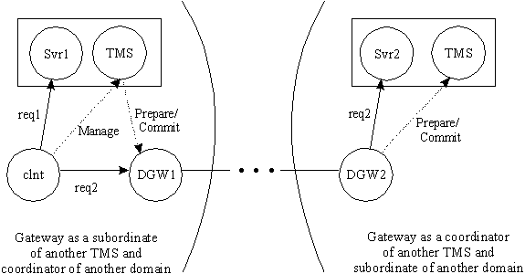 In /Domain, gateways are not associated with an XA-compliant resource manager. The Transaction Processing Working Group (TPWG) of X/Open has proposed an advanced XA interface. System/T elected not to use it because the interface did not match the highly asynchronous and non-blocking model required by the gateway. While /Domain gateways do not use a separate TMS server, they do offer the TMS capability, which allows gateways to coordinate the two-phase commitment of transactions executed across domains. This is accomplished as follows: