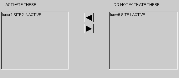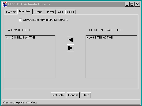 Two lists appear on the Activate folders for all objects except Domains: ACTIVATE THESE and DO NOT ACTIVATE THESE. The BEA TUXEDO objects on the ACTIVATE THESE list will be activated; objects on the DO NOT ACTIVATE THESE list will not be activated. By moving an object name into the appropriate list, you can specify whether the object will be activated or not.