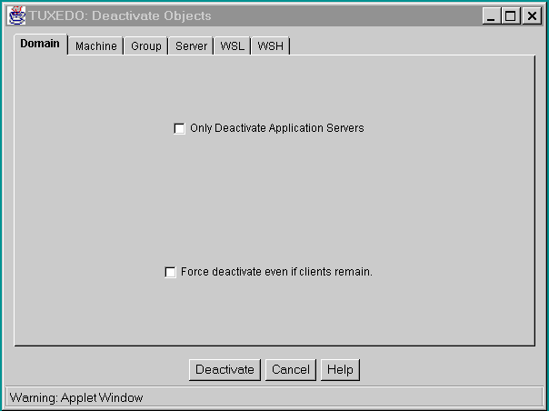 Two lists appear on the Deactivate folders for all objects except Domains: DEACTIVATE THESE and DO NOT DEACTIVATE THESE. The BEA TUXEDO objects on the DEACTIVATE THESE list will be deactivated; objects on the DO NOT DEACTIVATE THESE list will not be deactivated. By moving an object name into the appropriate list, you can specify whether the object will be deactivated or not