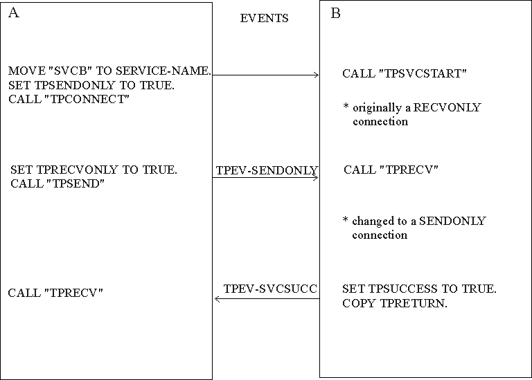 Figure 13-1 shows a simple "A-to-B" conversation. The connection is set up initially with a call to TPCONNECT with the TPSENDONLY setting of the TPSENDRECV-FLAG IN TPSVCDEF-REC set. In due course, A turns control of the connection over to B by calling TPSEND with a valid setting of TPRECVONLY. This generates a TPEV-SENDONLY event. The next call by B to TPRECV returns TP-STATUS IN TPSTATUS-REC set to TPEEVENT and TPEVENT set to TPEV-SENDONLY. B knows from the TPEV-SENDONLY event that it now controls the connection. Subsequently, B calls TPRETURN with TP-RETURN-VAL IN TPSVCRET-REC set to TPSUCCESS. This generates a TPEV-SVCSUCC event setting for TPEVENT IN TPSTATUS-REC for A. The call to TPRETURN also brings down the connection. When A calls TPRECV and learns of the event, it recognizes that the conversation has been terminated. Data can be received on this call to TPRECV even if the event is TPEV-SVCFAIL. In this illustration, A can be either a client or a server; B can be only a server.