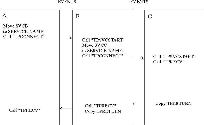 Figure 13-2 shows a hierarchy of connections. The scenario applies to a service in a conversation, B, that has initiated a connection to a second service, C. In other words, there are two active connections, A to B, and B to C. If B is in control of both connections, a call to TPRETURN has the following effect: the call will fail, a TPEV-SVCERR event setting for TPEVENT IN TPSTATUS-REC will be posted on all open connections and the connections will be closed in a disorderly manner. The proper sequence is for B to call TPSEND with the TPRECVONLY setting on the connection to C, turning control of the B-C connection over to C. C can then call TPRETURN with TP-RETURN-VAL IN TPSVCRET-REC set to TPSUCCESS, TPFAIL, or TPEXIT, as appropriate. B can then call TPRETURN, setting an event (either TPEV-SVCSUCC or TPEV-SVCFAIL) for A. Both connections are terminated normally.