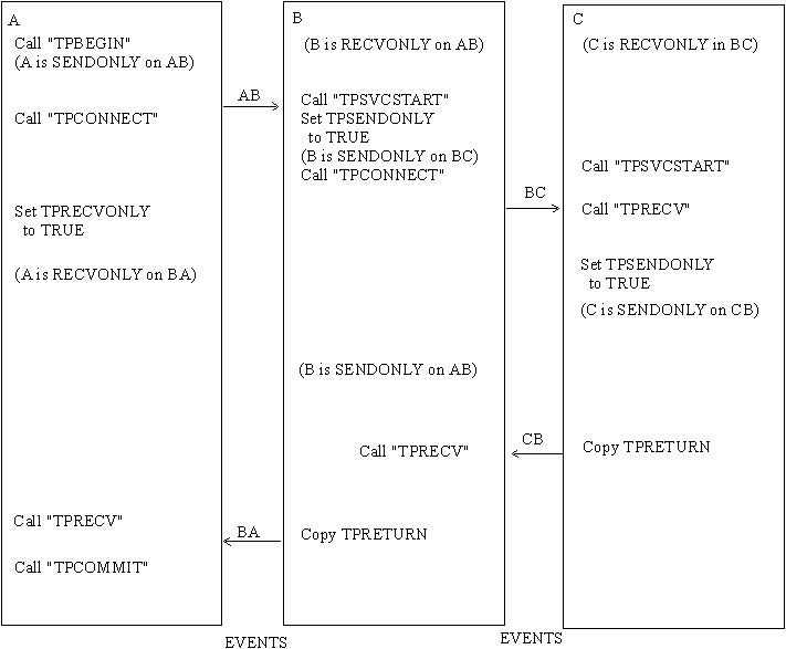 Figure 14-1 shows a conversational connection hierarchy that includes a global transaction. The originator of a connection in transaction mode (process A that called TPBEGIN followed by TPCONNECT) can call TPCOMMIT after all services have called TPRETURN. If a hierarchy of connections exists as it does in Figure 14-1, each subordinate service must call TPRETURN when it no longer has replies outstanding. A TPEV-SVCSUCC or TPEV-SVCFAIL event setting for TPEVENT IN TPSTATUS-REC is sent back up the hierarchy to the process that began the transaction. If all subordinates return successfully, the client (Process A) completes the transaction; otherwise the transaction is aborted.