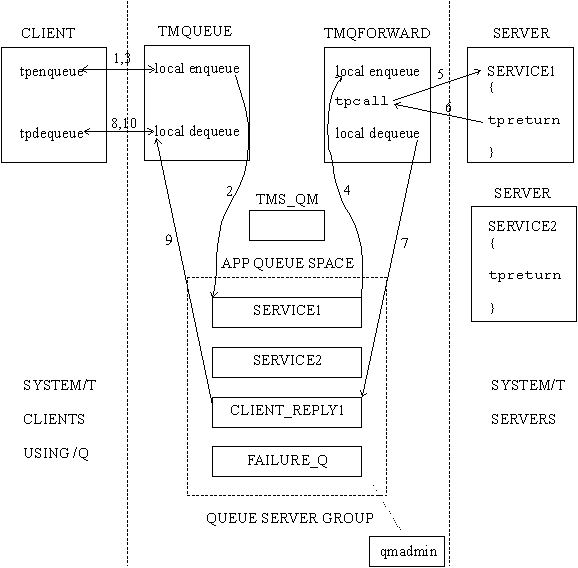 TMQFORWARD server dequeues the message and forwards it, via tpcall(3c), to a service with the same name as the queue name. In Figure 1-1 the queue and the service are named SERVICE1 and steps 4, 5, and 6 in the figure show this. The client identifier and the application authentication key are set to the client that caused the message to be enqueued; they accompany the dequeued message as it is sent to the service.