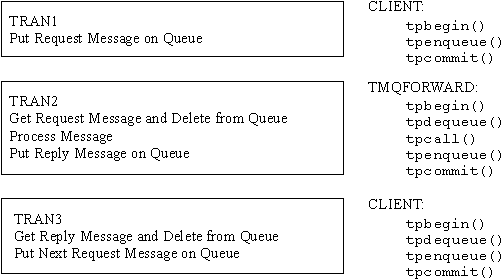 TMQFORWARD; the service is called with tpcall(), is executed and the reply is enqueued within the same transaction. A third transaction, started by the client, is used to dequeue the reply (and possibly enqueue another request message). In ongoing processing the third and first transactions can meld into one since enqueuing the next request can be done in the same transaction as dequeuing the response from the previous request.