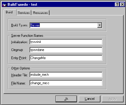 The Initialization and Cleanup options allow you to override the default init/exit functions by specifying valid function names. The Entry Point option allows you to specify the name of the function that BuildTuxedo generates. You can then call this function from anywhere in the application.