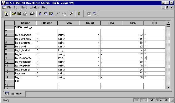 You must type You can open new (unnamed) view files in which a blank grid is created for the view, Viewx, where x is a value tracked by MFC and incremented by one each time you create a new view. You can specify a name if and when you save the view file. You can also edit an existing view file (either text or binary). Unless otherwise specified, files are saved in the directory where the file was opened in tabbed delimited format, with.v appended to the end of the filename when applicable. You can compile this file to produce either a 16- or 32-bit binary The Multiple Document Interface (MFC), as part of the basic framework, provides a multiple document architecture in which you can open documents and views, regardless of type, at the same time. Examples of this design are msdev, Excel, and Word. In BEA TUXEDO terms, you can open x number of FML tables and y number of VIEW Table files at any time, and then select to use any one of them. Documents look and feel like a workbook that contains tabs for each open document.