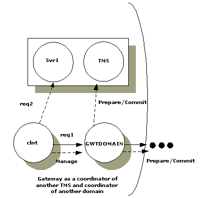 In a Domains environment, GWTDOMAIN gateways are not associated with an XA-compliant resource manager. The Transaction Processing Working Group (TPWG) of X/Open has proposed an advanced XA interface. This interface is not used in the BEA Tuxedo system because the interface does not match the highly asynchronous and non-blocking model required by the gateway. While Domains gateways do not use a separate TMS server, they do offer the Transaction Manager Servers (TMS) capability, which allows gateways to coordinate the 2-phase commitment of transactions executed across domains.