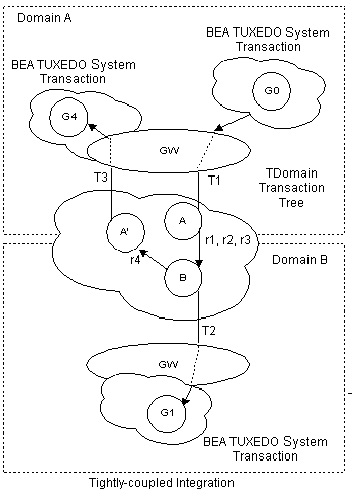 Transaction Trees for BEA eLink OSI TP and BEA Tuxedo Domains The following two figures show the transaction tree for BEA eLink OSI TP and the transaction tree for BA Tuxedo Domains. It is assumed, in these figures, that both Domains A and B are BEA Tuxedo system applications. BEA eLink OSI TP is loosely-coupled because of the OSI TP protocol. The transaction tree for this instantiation shows group G0 in Domain A coordinating the global transaction started by the client. Group G0 coordinates group GW. Requests r1, r2, and r4 are mapped each to an OSI TP dialogue and therefore to an OSI TP transaction branch. However, OSI TP uses the XAP-TP feature that allows an entire OSI TP transaction to be referred by a unique identifier (T1) and uses this identifier for requests r1, r2, and r3. It is up to XAP-TP to generate OSI TP transaction identifiers and to construct the corresponding OSI TP transaction tree. The only function that must be performed by the generic Domains software is the mapping of service requests r1, r2, and r3 to the T1 identifier. In Domain B, OSI TP uses the rule that new transaction branches must be mapped to a new BEA Tuxedo transaction. Therefore, OSI TP transaction branches r1, r2, and r3 get mapped to three different BEA Tuxedo transactions (the corresponding mapping is represented by identifiers T2, T3, and T4). The graph shows the gateway group GW in Domain B coordinating three BEA Tuxedo transactions on group G1. Finally, there is the loopback service request r4 that generates another branch in the transaction tree. OSI TP maps this request to identifier T2, but XAP-TP generates a new branch in its transaction tree (r4: B to A'). This is a new transaction branch on Domain A, and therefore, the gateway generates a new mapping T5 to a new BEA Tuxedo transaction. Therefore, the transaction graph shows that gateway group GW on Domain A coordinates group G4. Notice that the hierarchical nature of the OSI TP protocol is fully enforced by these mappings. However, because these mappings introduce a loosely-coupled relationship, the probability of intratransaction deadlock is increased (for example, there are three BEA Tuxedo transactions accessing the RM represented by group G1). Transaction Tree for BEA eLink OSI TP Environment