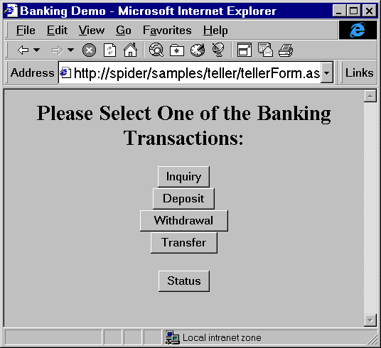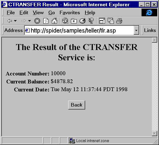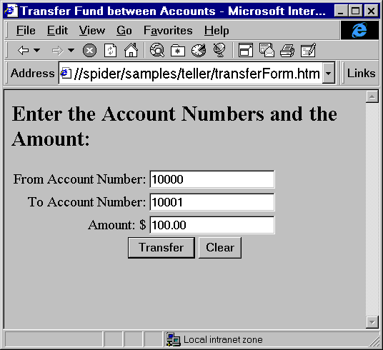 Complete the fields From Account Number, To Account Number, and Amount. (10000 and 10001 are valid BankApp account numbers). Click the Transfer button. The data entered on the form is sent to the Web server for processing by the program tlr.asp as specified in the ACTION field of the form.