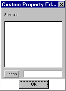 The Custom Property Editor of JoltBeans reads cached information. Initially, no cached information is available, so when the Property Editor is used for the first time, the dialog box is empty. Log on to the Jolt Repository and load the property editor cache from the repository. For details about the logon and using the Property List and Property Editor, see Using the Jolt Repository and Setting the Property Values.