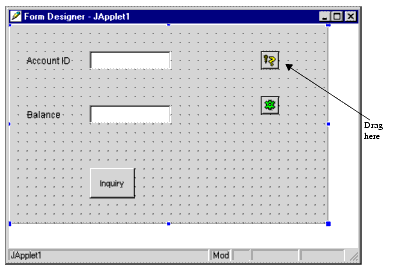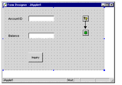 The sample form is created using an integrated development environment (IDE), in this example, Visual Café 3.0. The example demonstrates how to build an applet that allows you to enter an account ID and use a BEA Tuxedo service to get and show the account balance.
